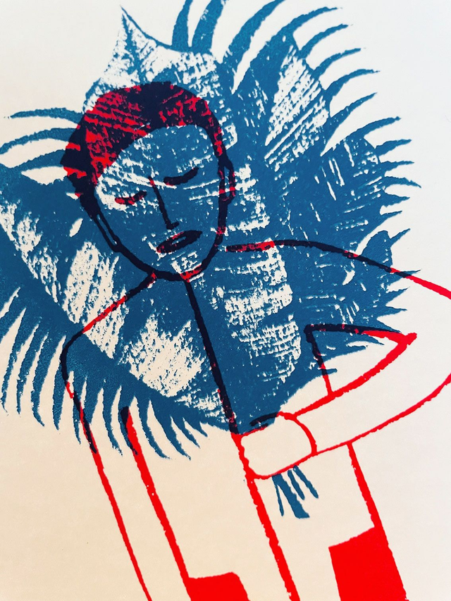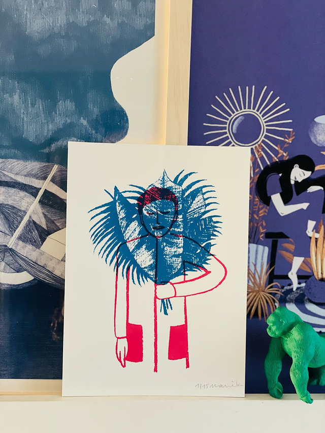 sérigraphie 2 couleurs — format A5 (15x21cm) — papier Arches 30g numérotée à 15 exemplaires s'inscrit dans une série de 4 illustrations (le plongeon, l'œil et la sorcière)